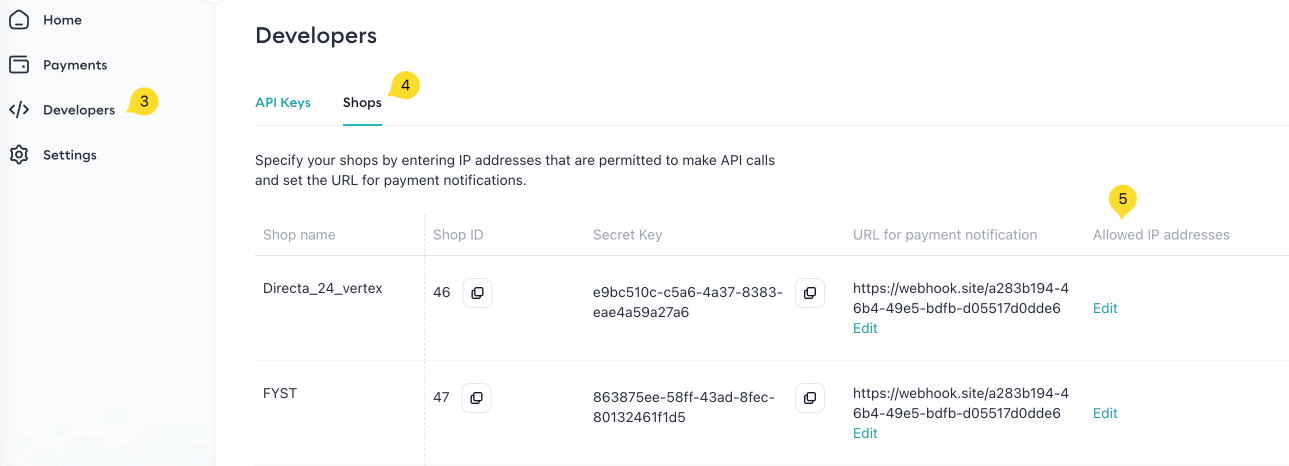 - You will see a list of Shops. For each store, specify the list of IP addresses that will be sending requests.